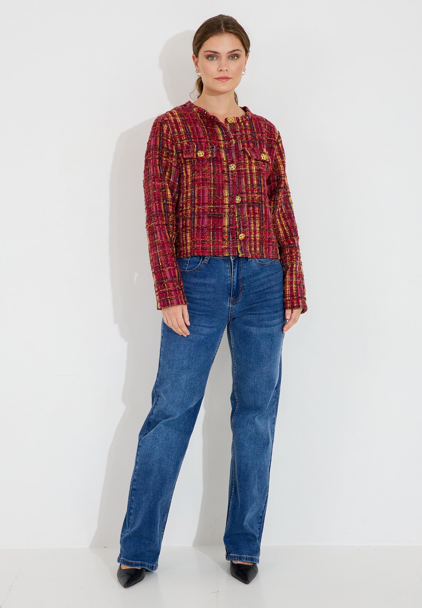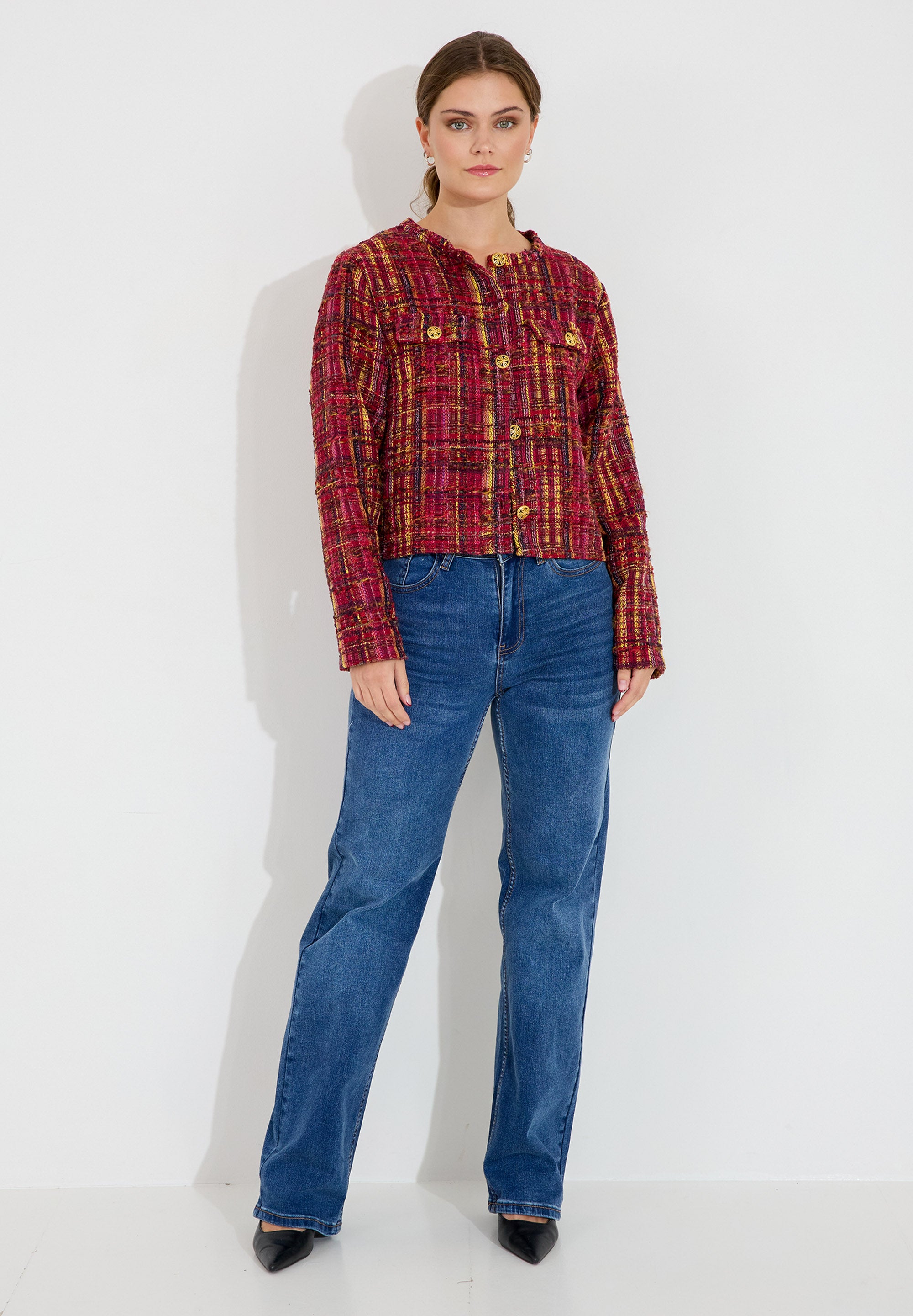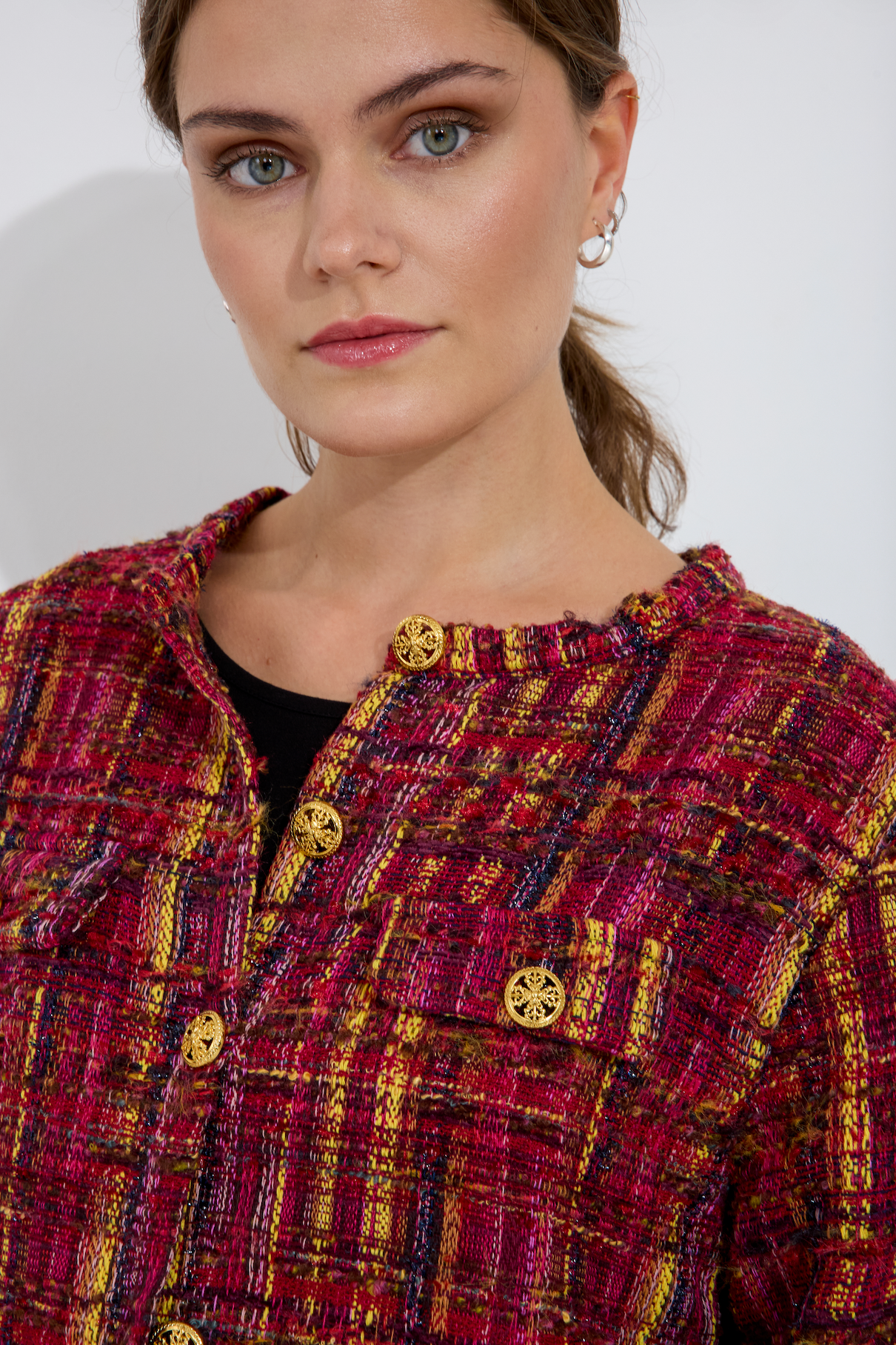 Chanel-inspirerad tweed jacka med snygga guldknappar, lagom kort för att sitta snyggt.