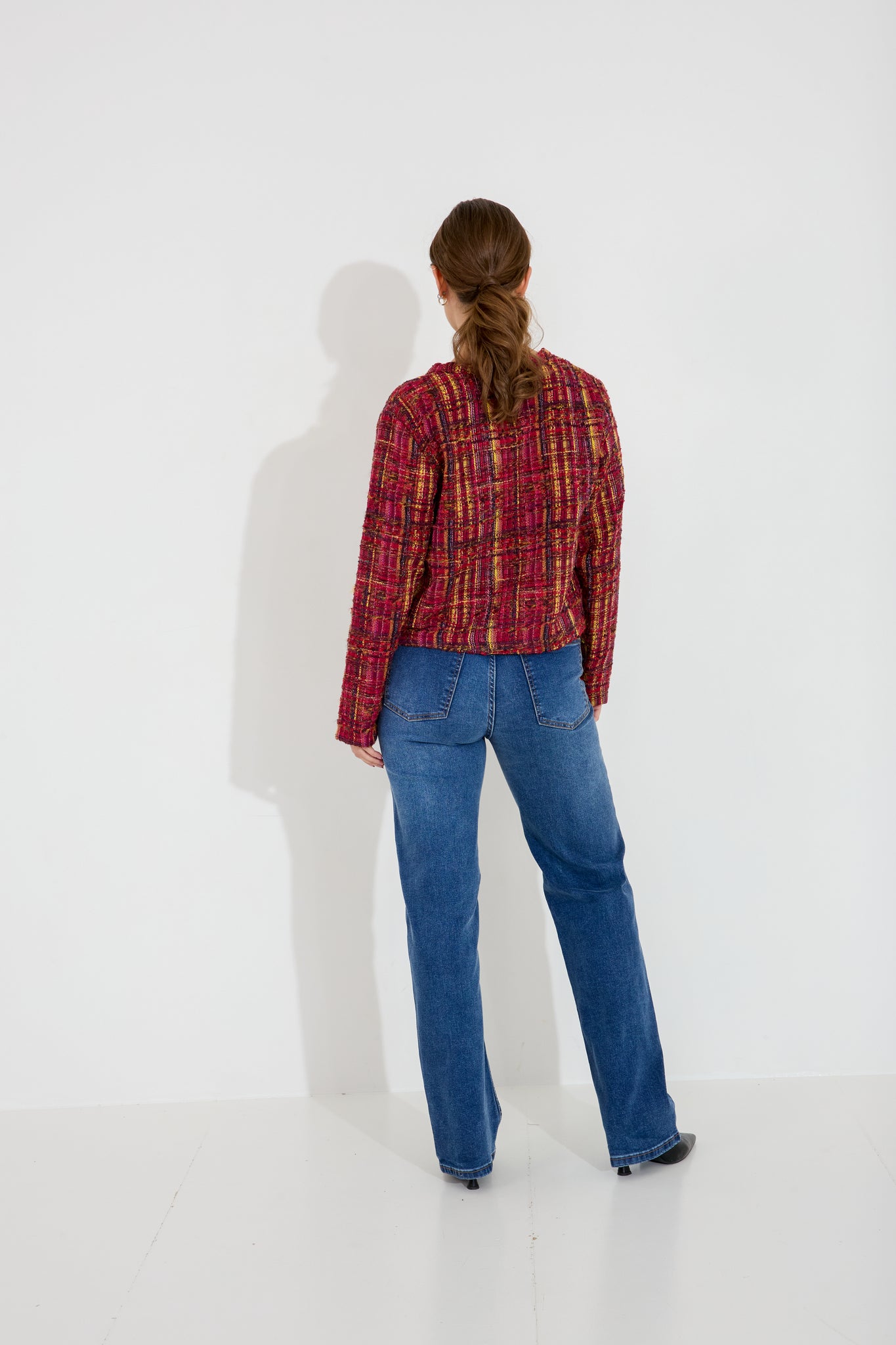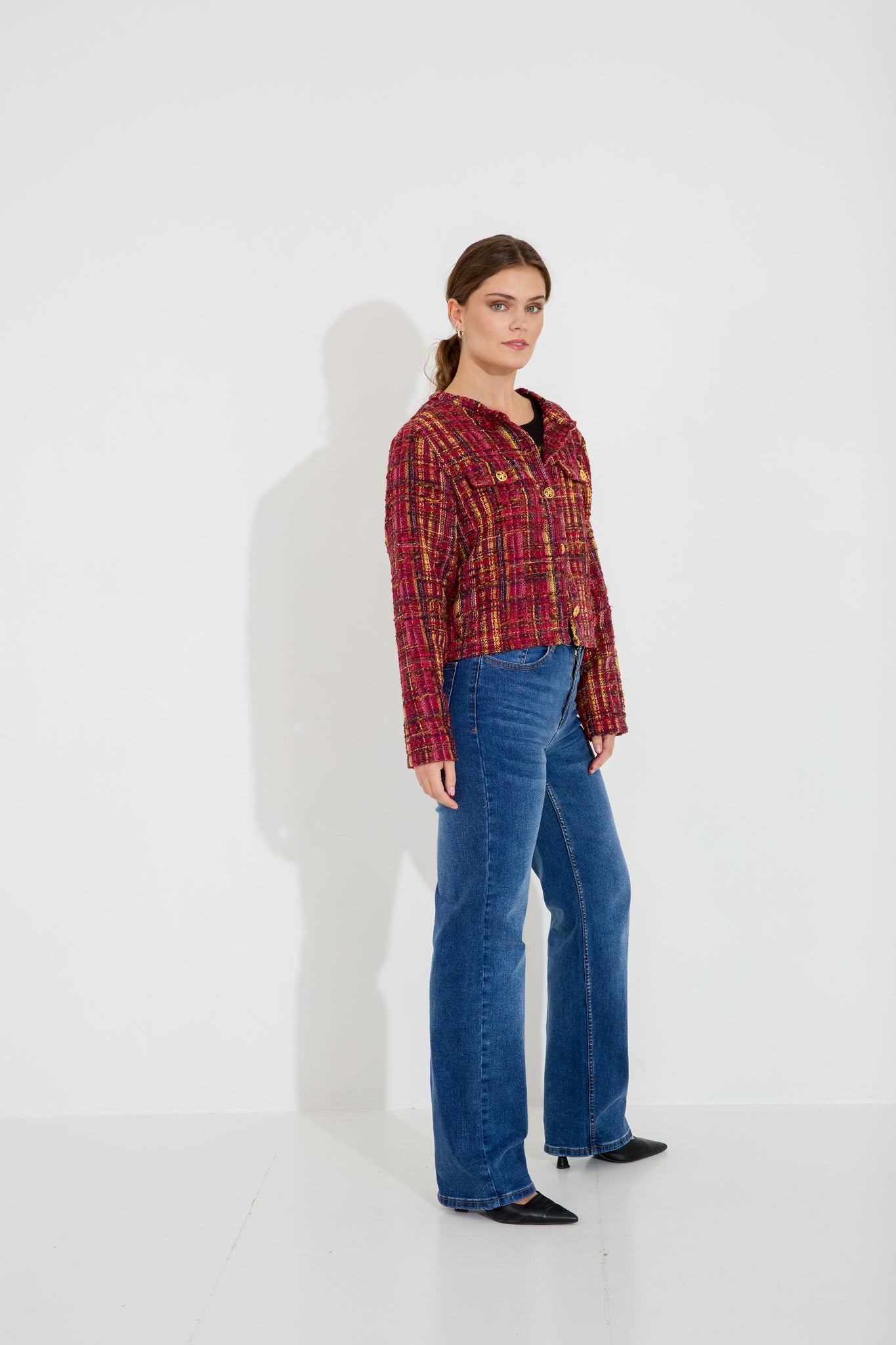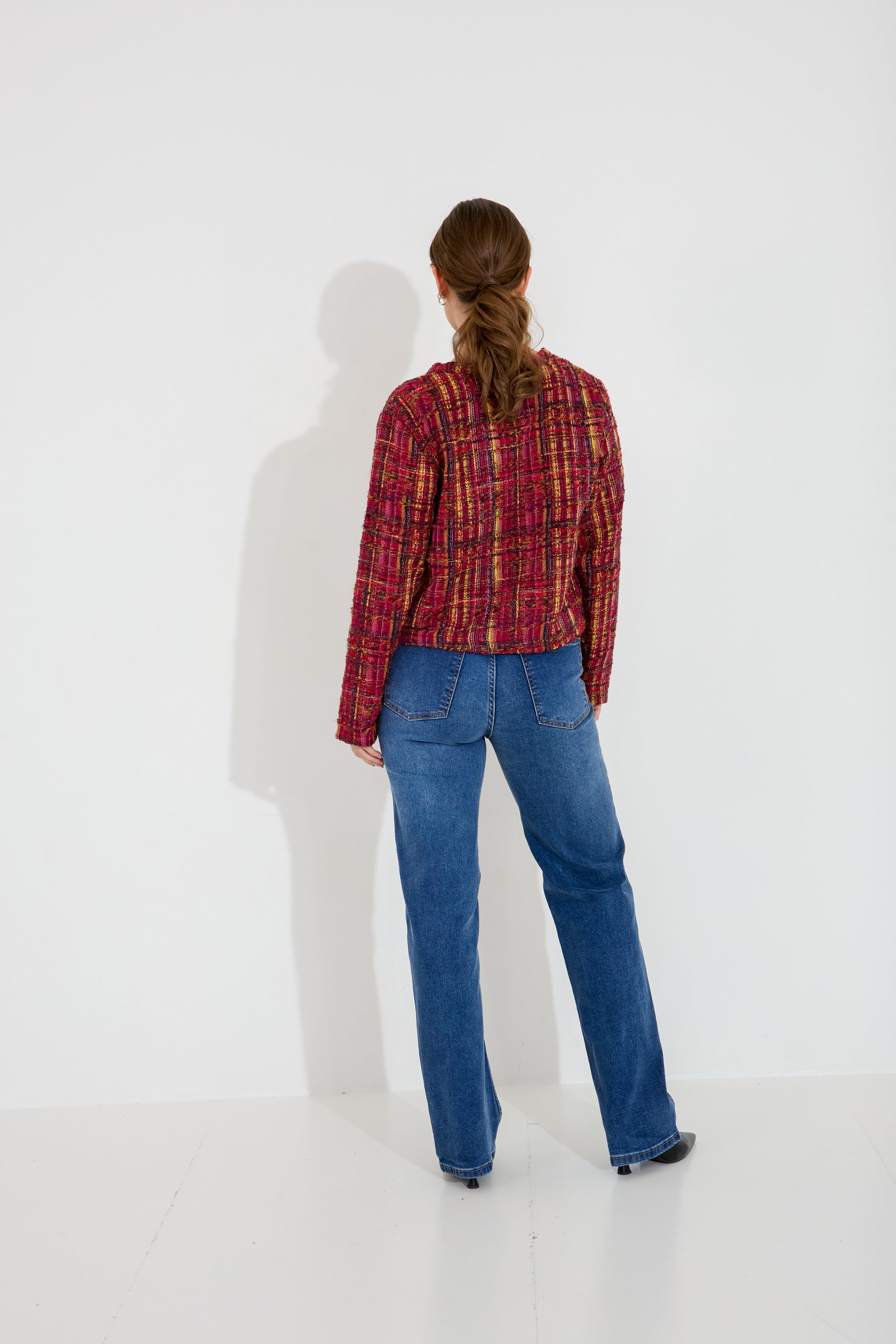 Chanel-inspirerad tweed jacka med snygga guldknappar, lagom kort för att sitta snyggt.